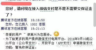 不过,微信支付的官方在线客服基本上已经对这一情况有统一的回应。“为了给更多的用户提供微信支付电商平台,2014年9月10日起公众平台(公众号支付)、开放平台(App支付)申请微信支付功能,暂免收保证金。”