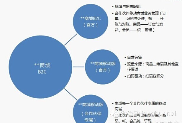 微商城系统是实现这一O2O模式的技术载体,和一般的微商城应用不同的是,利用了服务商既有成熟的电商系统(国内老牌的电商软件服务商),生成可扩展的微信移动商城,每一个微信商城都是独有的,因此微信商城的二维码也是唯一的。系统相对成熟、稳定,前端统一销售,后端集中处理订单、实现品牌商与合作伙伴的及时分账与会员管理,具体结构与功能,如下图所示: