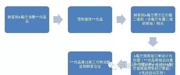异业合作的O2O业务场景,相对于专卖店O2O的业务场景会更复杂,这样的业务场景,涉及到的要素有就餐的客人、餐厅、导购、肉品厂商、微商城系统。我们逐一分析:
