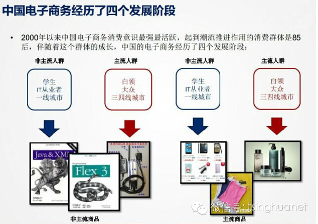 当消费者是非主流人群买非主流产品的时候,商家都没有看到电子商务。认为那些小孩子气的小玩意儿不是大商家的主流产品,大商家也不卖这些,这是第一阶段。
