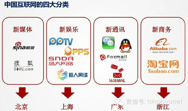 所以中国四大互联网的流派聚集地主要就是分为讲政治的爱玩的,能搞通讯的,能经商的这四个地区。任何新的互联网模型公司都能归为其中一类。