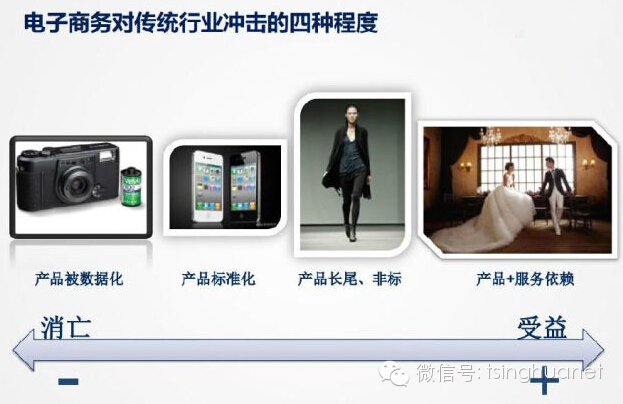 第四类,如果你的行业是产品加服务,那么你能从互联网获益就更大了。线下店不仅不会消亡,还可以大力发展。因为他卖的服务是网上不能替代的,比如说婚纱摄影,比如说餐饮、理发,电脑不可能高科技到那个程度。