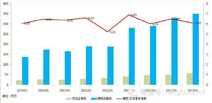 从2010年上半年开始,携程与艺龙的营收占比一直保持在6:1以上,只有2012年第一季度较低,但在2012年下半年携程跟进艺龙价格战后,营收的差距再度拉开。