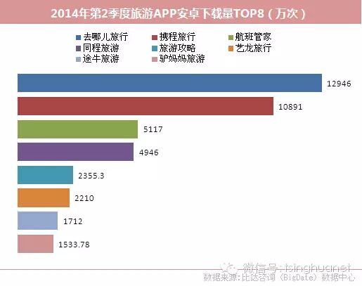 根据第三方比达咨询数据显示,截至2014年第2季度,去哪儿旅行下载量为1.29亿次,位居市场第一,携程旅行以1.09亿次下载量位居第二,二者下载量均为艺龙的5倍以上。