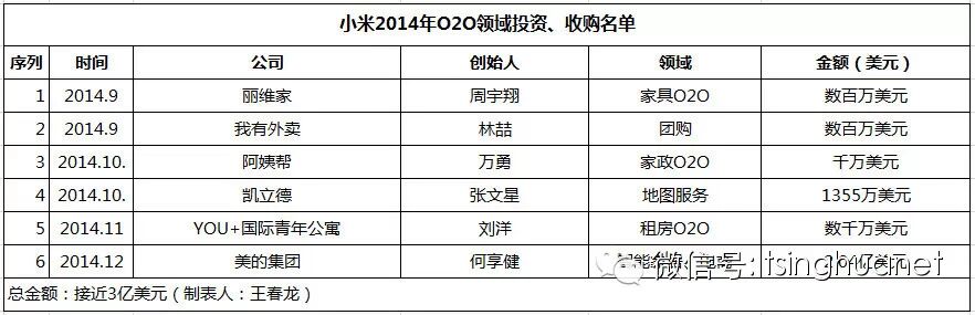 2014年O2O领域很难看到小米的身影,你们以为它忽视了么?其实长袖善舞的雷布斯,是在用旗下的顺为资本扮演VC的角色,专门做投资。我们熟悉的顺为资本在小米多轮融资下扮演了重要角色,但其实在O2O行业,雷军也依靠顺为投资了很多O2O初创公司。