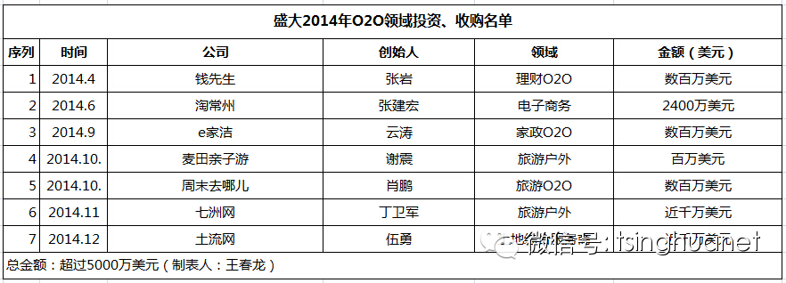 盛大作为中国最早成功的互联网公司,2014年已经完全将游戏业务剥离,盛大的两兄弟陈天桥和陈大年负责不同的内容,哥哥做投资,弟弟搞实业。在过去一年O2O领域的投资当中,可以看到盛大资本忙碌的身影,布局理财、旅行、家政等各个垂直O2O行业。与小米的顺为资本类似,盛大资本也扮演着VC的角色。