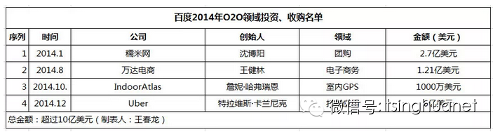 百度作为BAT当中在O2O领域动作幅度最小的互联网公司,2014年其心思还是主要花费在原有平台模式之下。百度寄希望于将自身的产品,如百度直达号、百度糯米、手机百度、百度地图和百度钱包进行整合,这种战略是非常理性的,但似乎百度在O2O的野心上似乎与阿里巴巴和腾讯相去甚远。翻看百度过去一年间在最为火爆的O2O领域的动作,发现其最大的行为来自对Uber的投资,而这仅仅是对于腾讯和百度在这一领域的一场被动的防御而已。