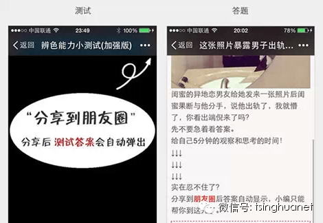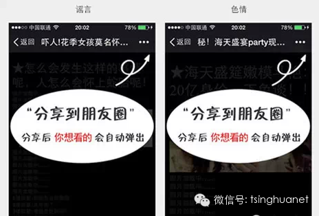 1.诱导分享:发送谣言、色情、测试类、答题类等内容诱导用户分享至朋友圈,分享后用户才可见到答案或内容。