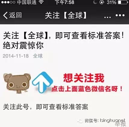 2.诱导关注:发送谣言、色情、测试类、答题类等内容诱导用户关注公众号,关注后用户才可见到答案或内容。