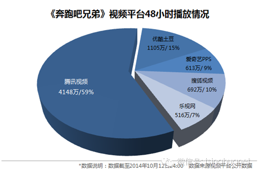 播放表现这么重要,经过了48小时,《奔跑吧兄弟》在各大视频平台播放实际情况究竟怎样呢?腾讯视频单平台的播放量已经突破4100万,全网占比近60%,爱奇艺PPS、搜狐视频以及乐视网的播放量相差无几,占比在10%上下浮动。优酷土豆双平台的播放量刚过1100万,虽然占比有15%,将近腾讯的1/4,但是与其他视频平台相比,算是保住了老二的位置。