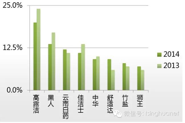 高露洁、黑人、佳洁士这几大成熟品牌的市场份额均呈现一定程度下跌。这部分市场份额被主推抗敏感牙膏的舒适达和主要针对化解牙龈出血问题的云南白药牙膏等强调特殊功效的品牌所掠取。