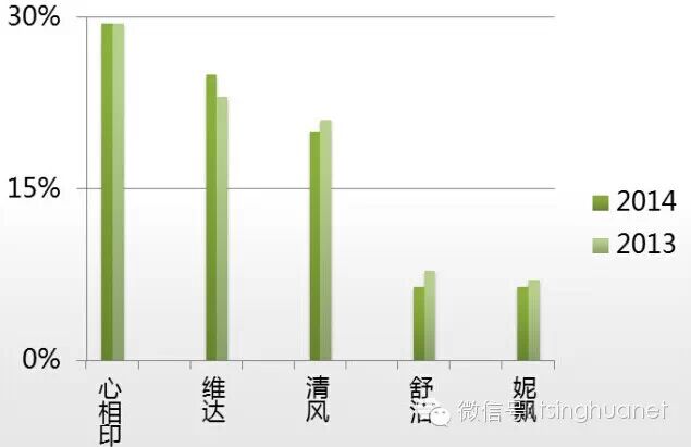 心相印连续6年始终保持行业第一的地位。但今年29.26%的占比较去年的29.43%略有下跌,更与2011年时41.02%的绝对优势相去甚远。