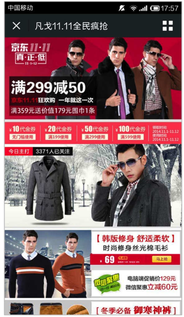 与其他微商平台相比,在刘毅看来,目前京东微店效果已经遥遥领先。因为,顾客会觉得,有京东的信誉背书,京东微店更有保障,又有大入口的流量优势,这也是其他平台不具备的,这种转化率会更高。凡戈男装的京东微店,借助京东直投无线产品,在今年双11当天,销售突破106万,比投放广告前,成交增长15倍以上!