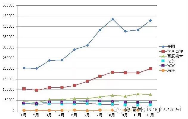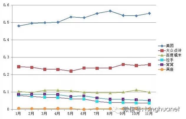 从市场份额占比看来,美团、大众点评、百度糯米份额基本在胶着状态,没有明显提升,拉手、窝窝、满座则有比较明显的下降。