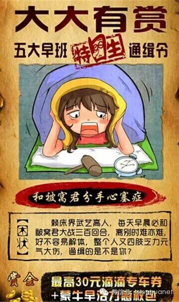 蒙牛早餐奶借助这一社会热点和话题点,用互联网语言将“早活力缺乏症”的人群归纳为五类,并发布了五道“特困生通缉令”:和被窝君分手心塞症、饿成绳精不能忍症、加班会困shi症、和懒洋洋一起猫冬症、不过凌晨不碎觉强迫症。满足以上任意一条or几条?别跑,你就是“早活力拯救计划”的通缉对象!坐在专车上,喝着早餐奶,赢取iPhone6,分分钟脱胎换骨变身人生赢家活力党。